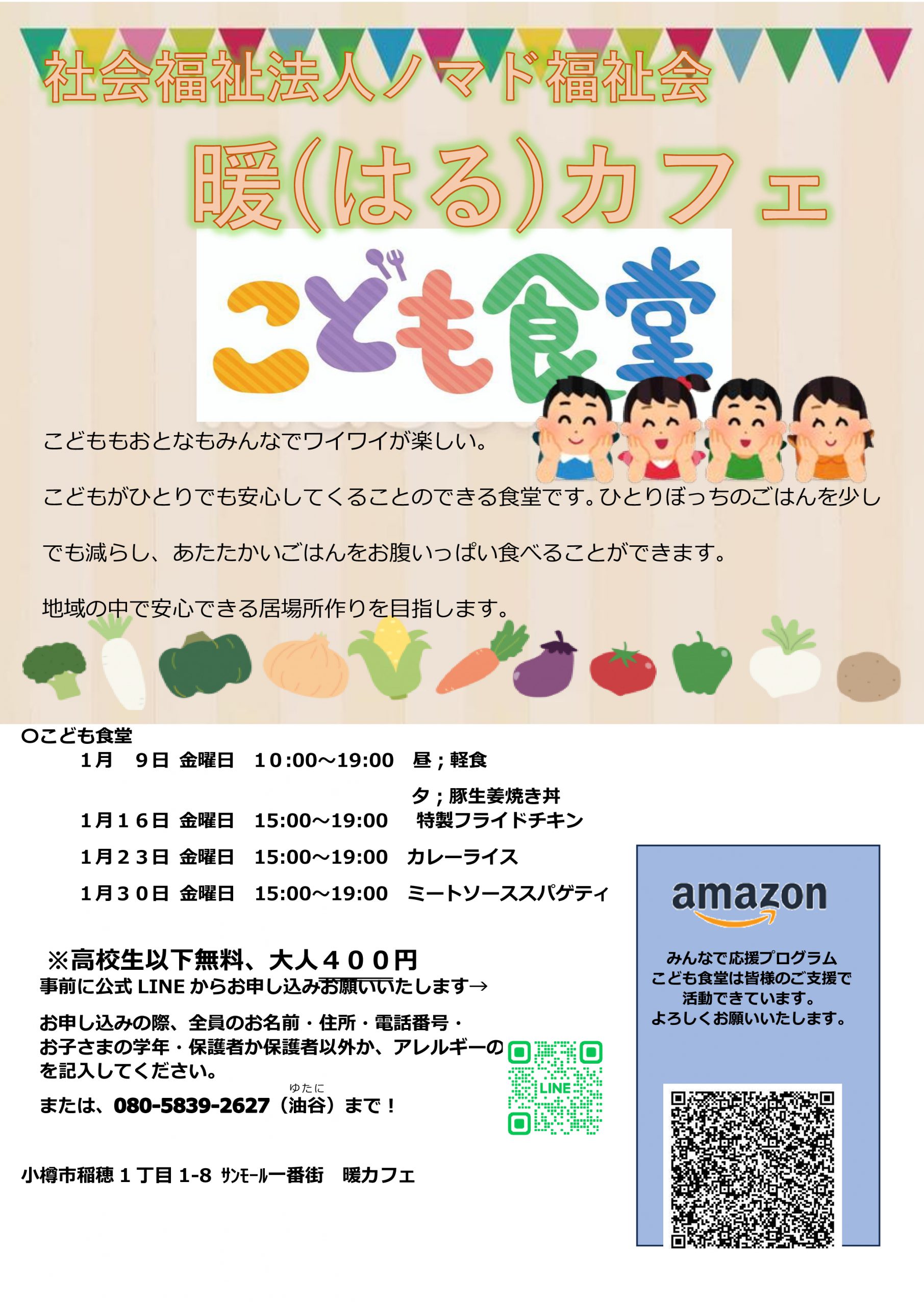 2026/1/8 NEW 令和8年1月『こども食堂』開催のご案内 暖カフェにてこども食堂を開催いたします。提供数には限りがあります。提供数に達し次第受付は終了となります。詳細はこちらをご確認ください。 前の記事へ 記事一覧へ 次の記事へ