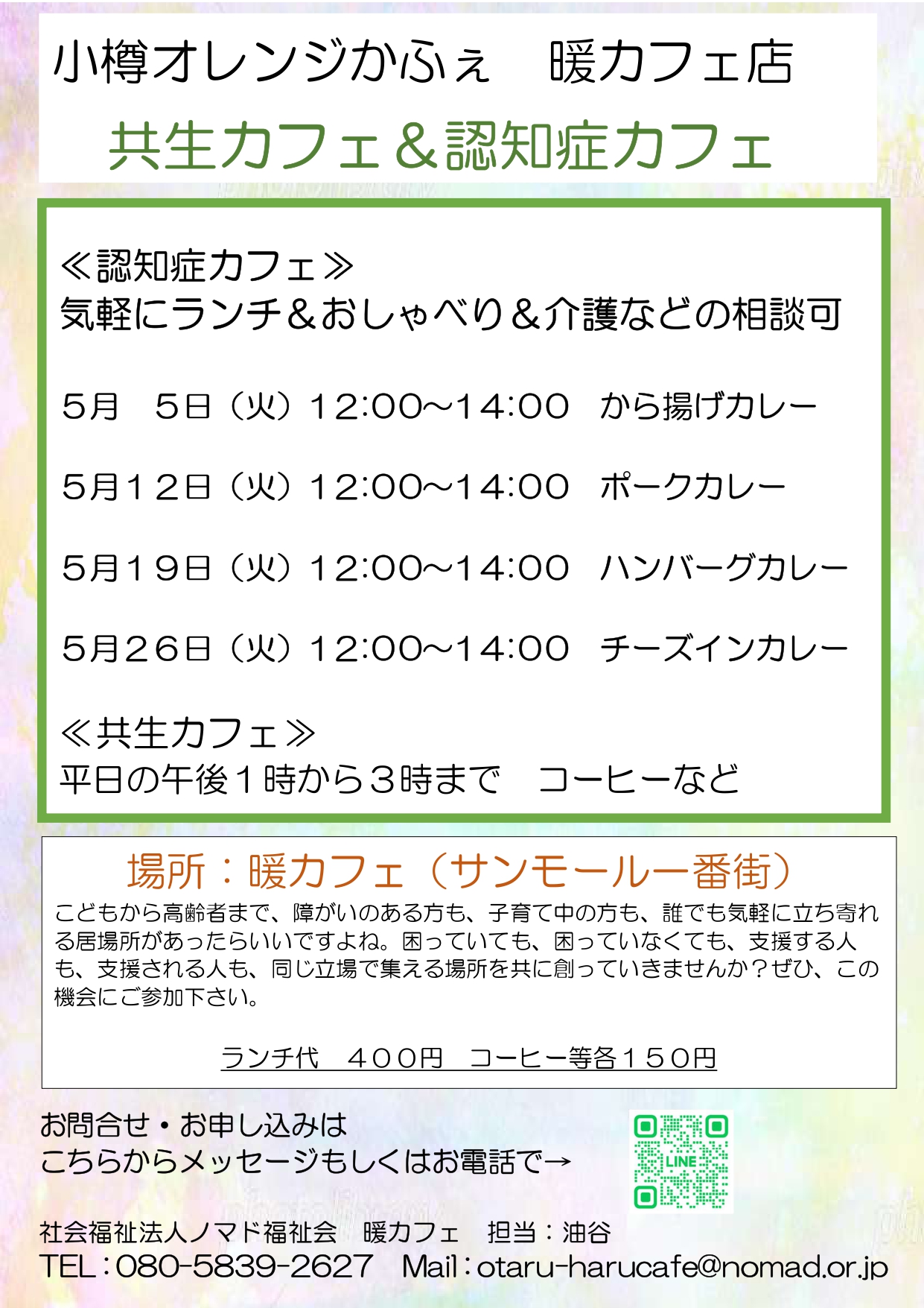 2026/4/24 NEW 令和8年5月『認知症カフェ』開催のご案内 暖カフェにて認知症カフェを開催いたします。定員に達し次第受付は終了となります。詳細はこちらをご確認ください。 前の記事へ 記事一覧へ 次の記事へ